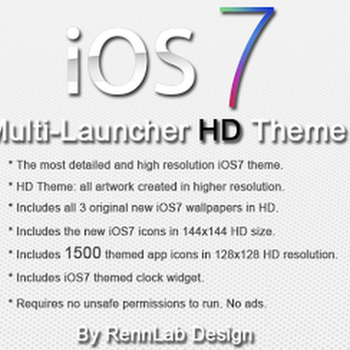 Overview: The most faithful, highest iOS7 - iPhone HD 5 in 1 Theme APK 2.0 for android application quality & detailed multi launcher theme of the new iPhone iOS7 interface and in HD! (checkout the screenshots) with the original icons of iOS7 in full 144x144 high resolution and 1500 icons iconpack, original wallpapers in HD, and fully customised with the iOS7 look.
